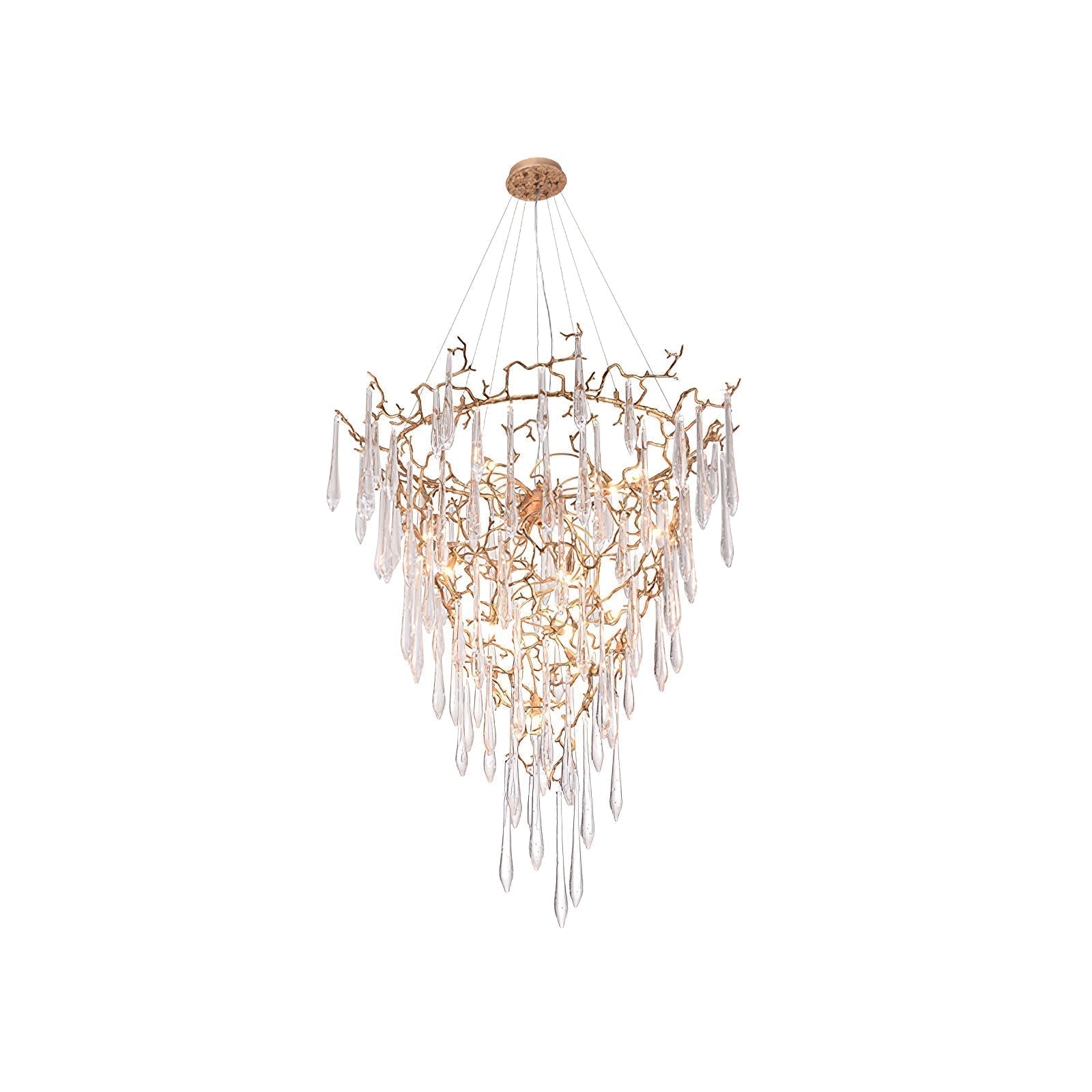 Inspired by Winter water drops. both by its element of inspiration and by its inherent association with our identity, expressing a strong connection to our main inspiration source, nature. The brass structure expands in entangled branches that lead to floating glass pieces, a characteristic that concedes an airy touch together with its delicate and elegant look, concepts visible in the smallest detail of the glass drops. Through several chromatic choices and design options, the Aqua Collection presents itself as an exquisite nature-inspired piece, perfect for any concept.