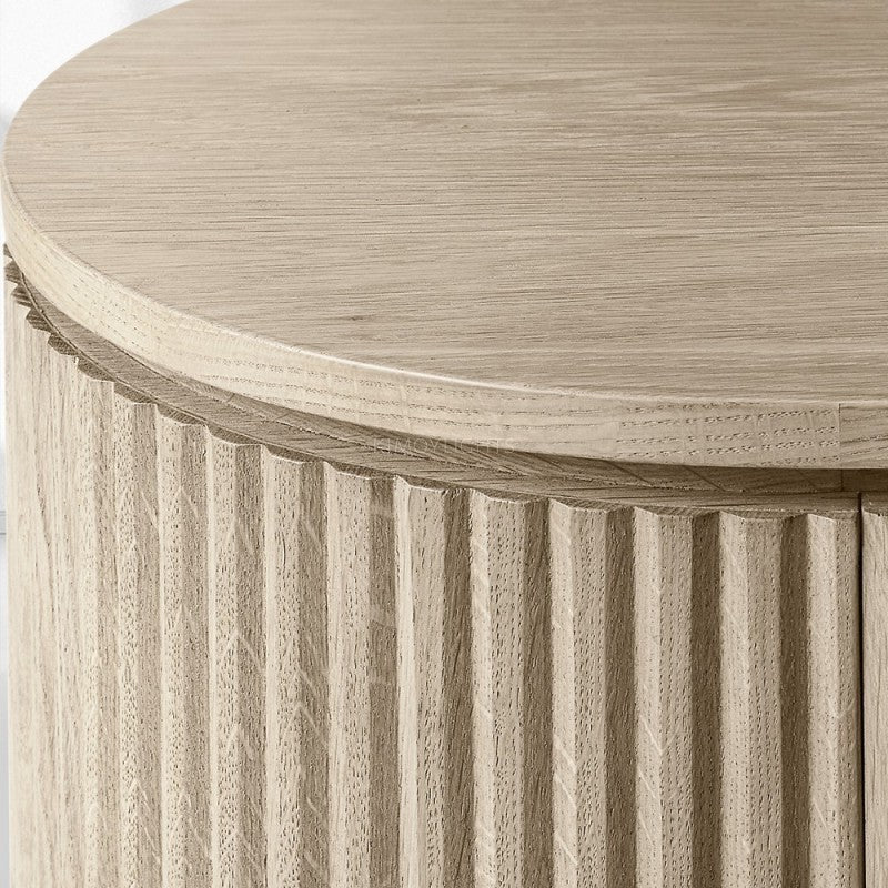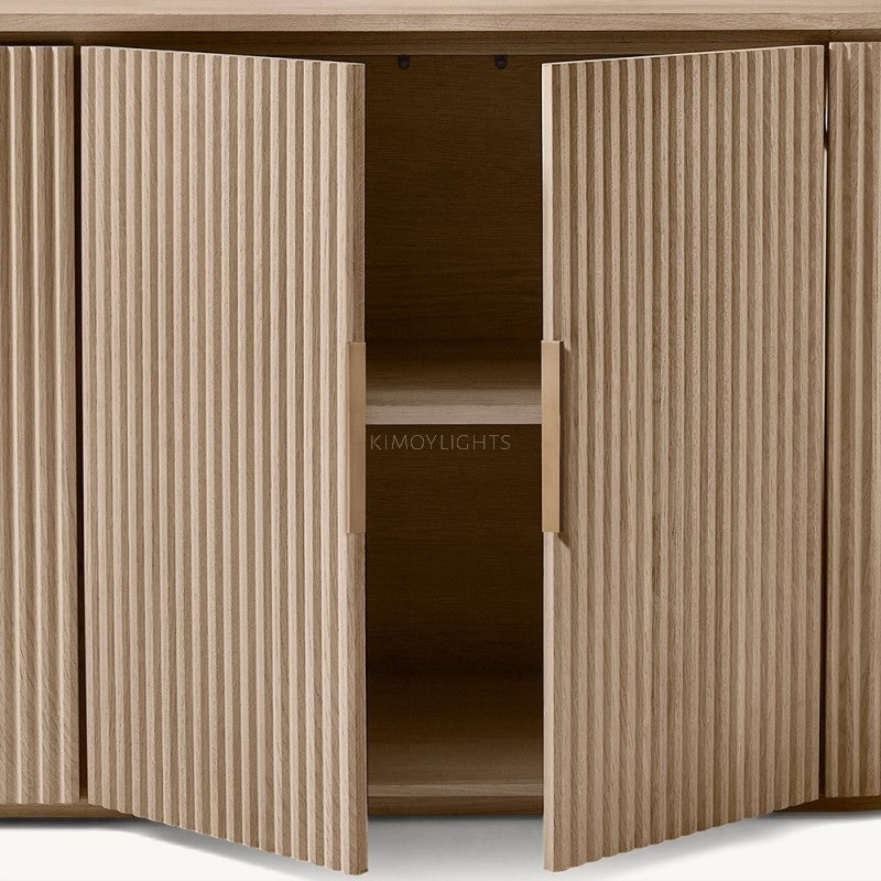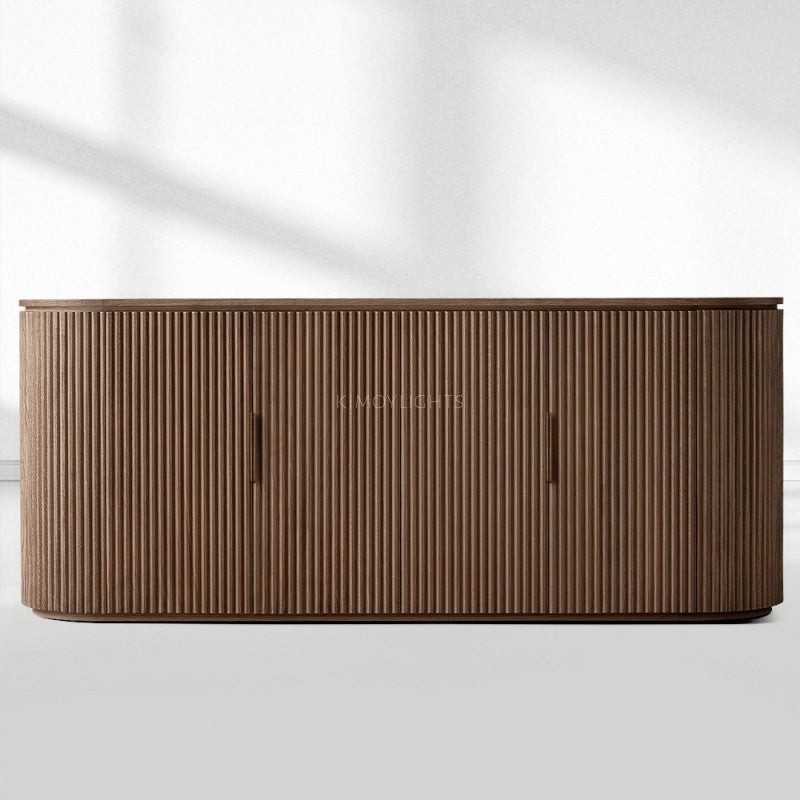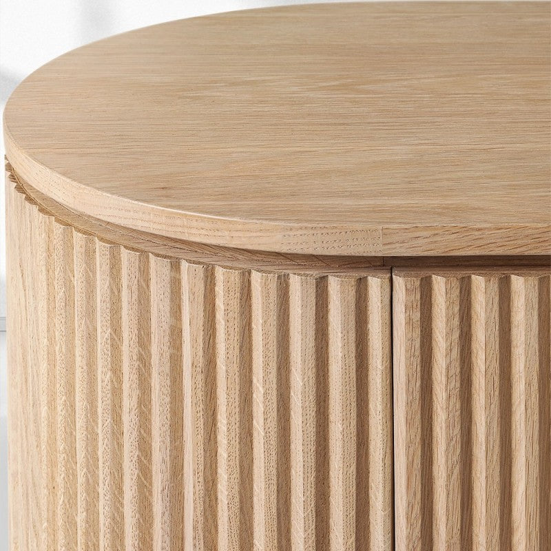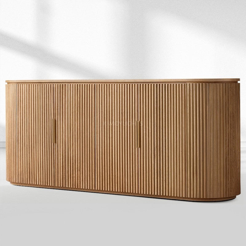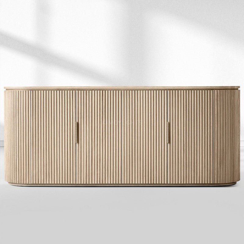 Our collection is handcrafted of reeded American white oak. The contemporary silhouette appears almost fluid in nature, seeming to float on a recessed plinth base.