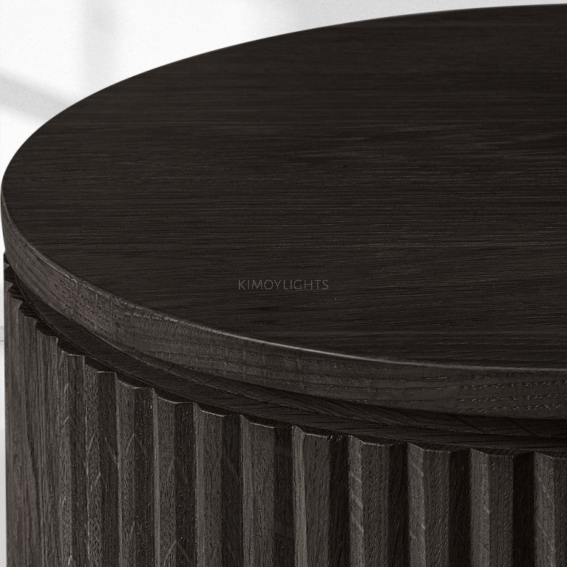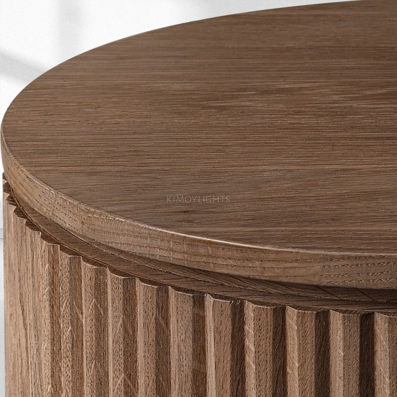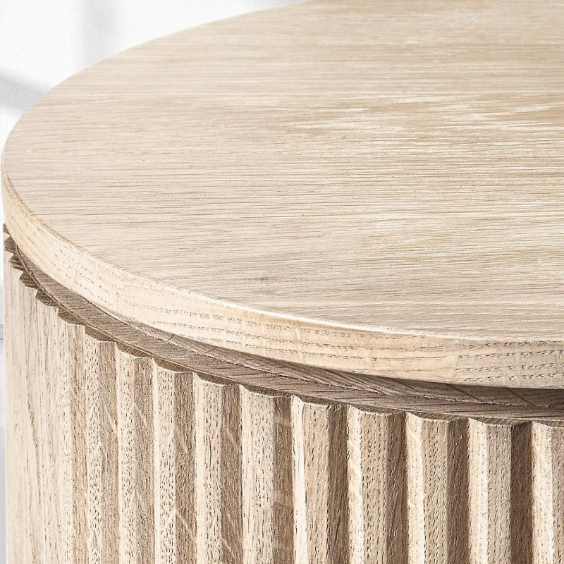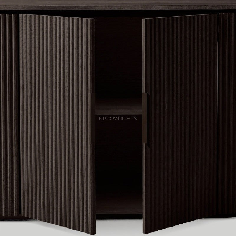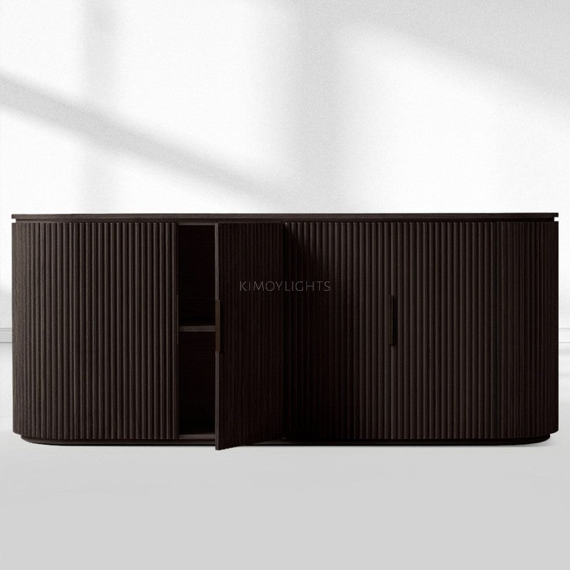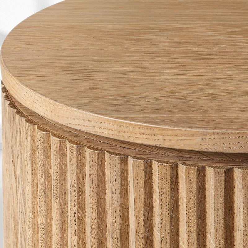 Our collection is handcrafted of reeded American white oak. The contemporary silhouette appears almost fluid in nature, seeming to float on a recessed plinth base.