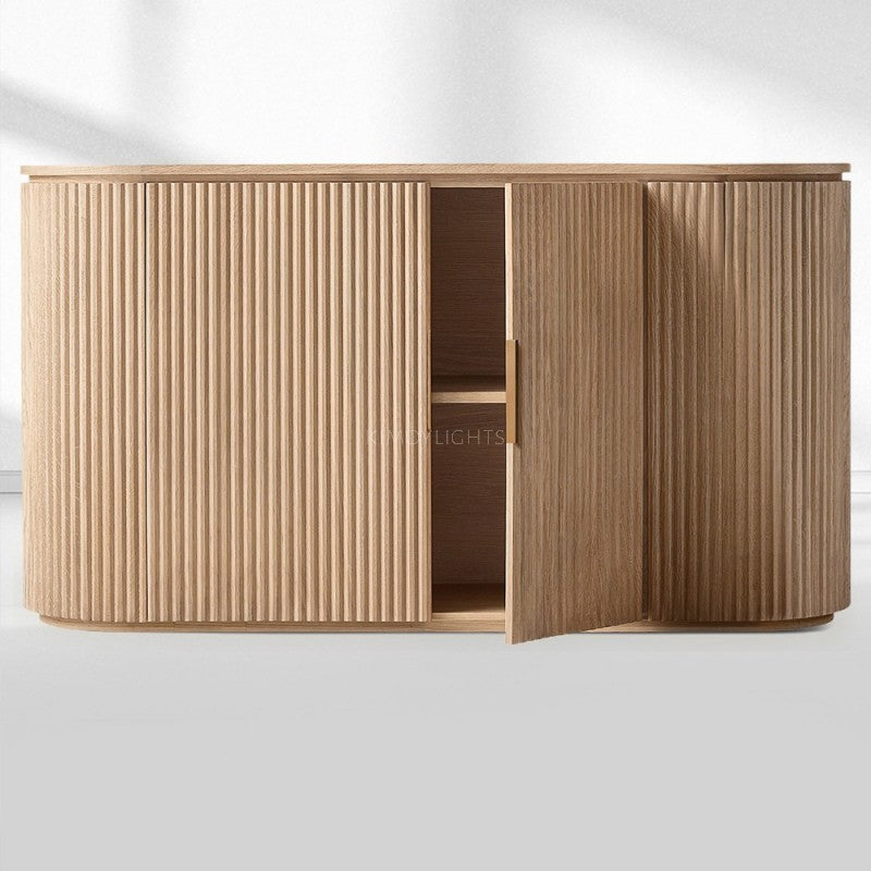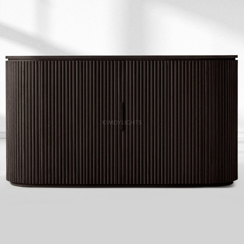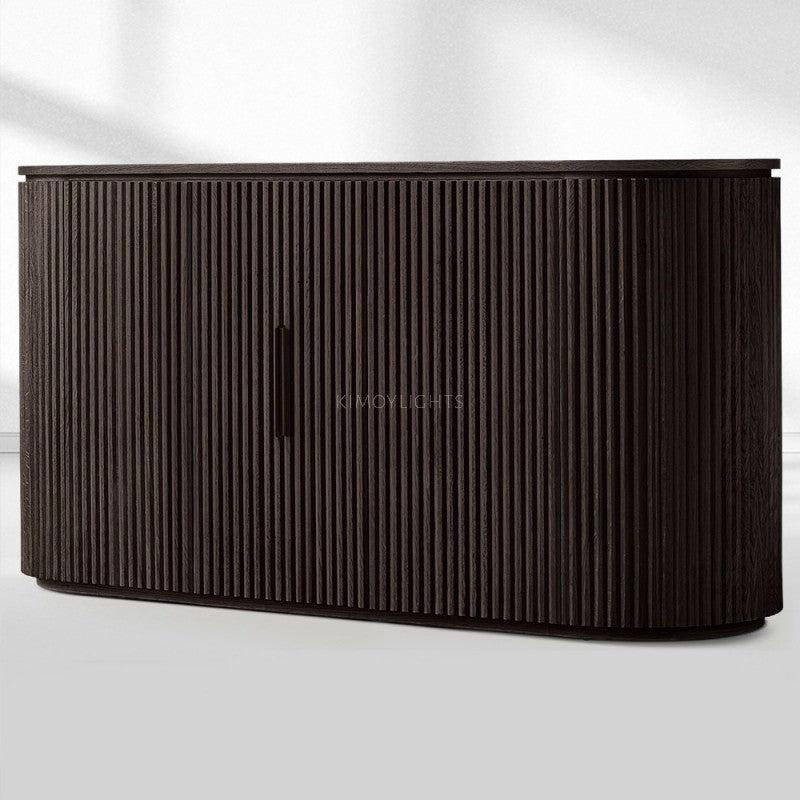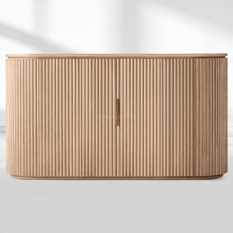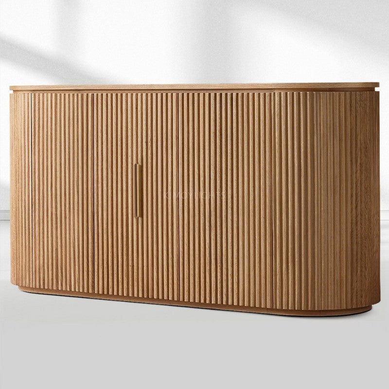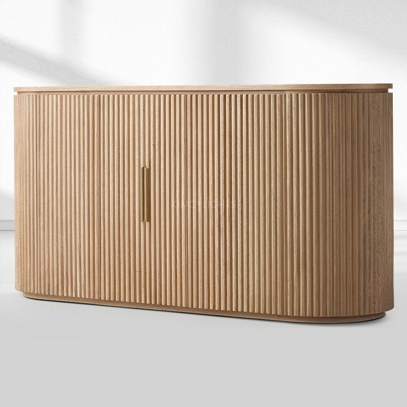 Our collection is handcrafted of reeded American white oak. The contemporary silhouette appears almost fluid in nature, seeming to float on a recessed plinth base.