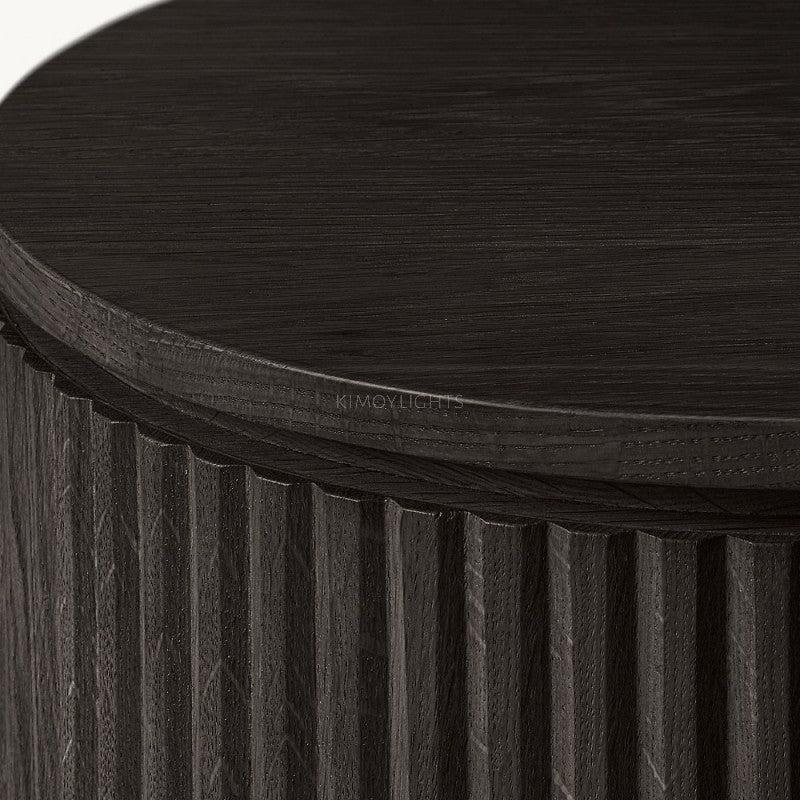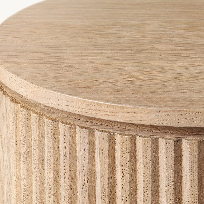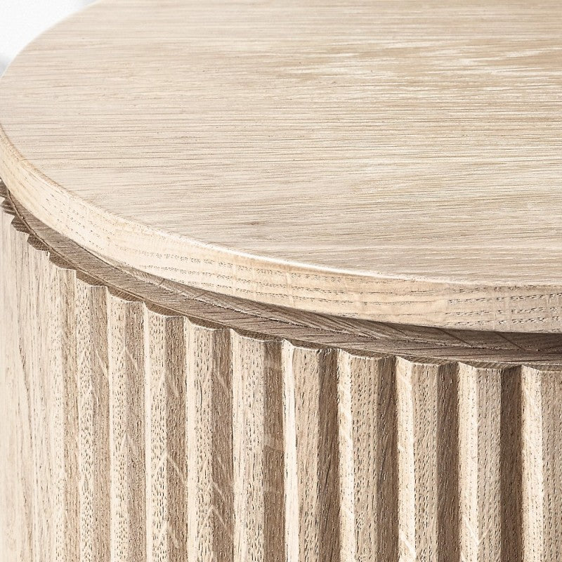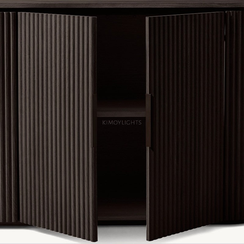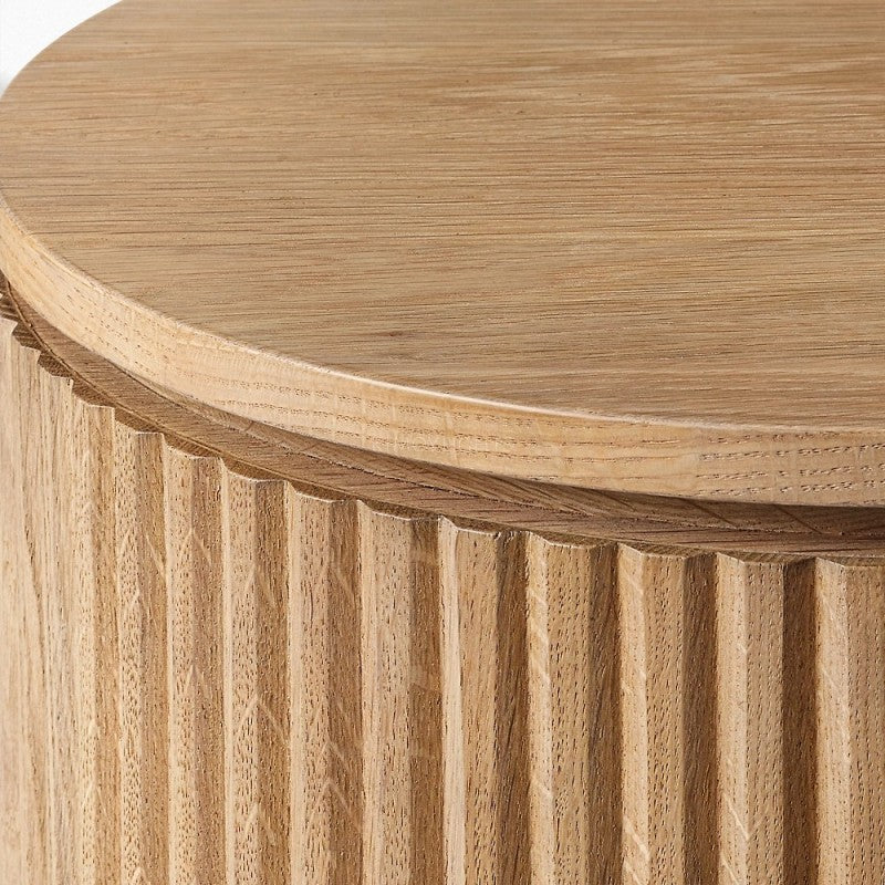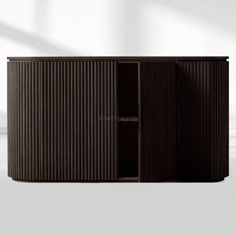 Our collection is handcrafted of reeded American white oak. The contemporary silhouette appears almost fluid in nature, seeming to float on a recessed plinth base.