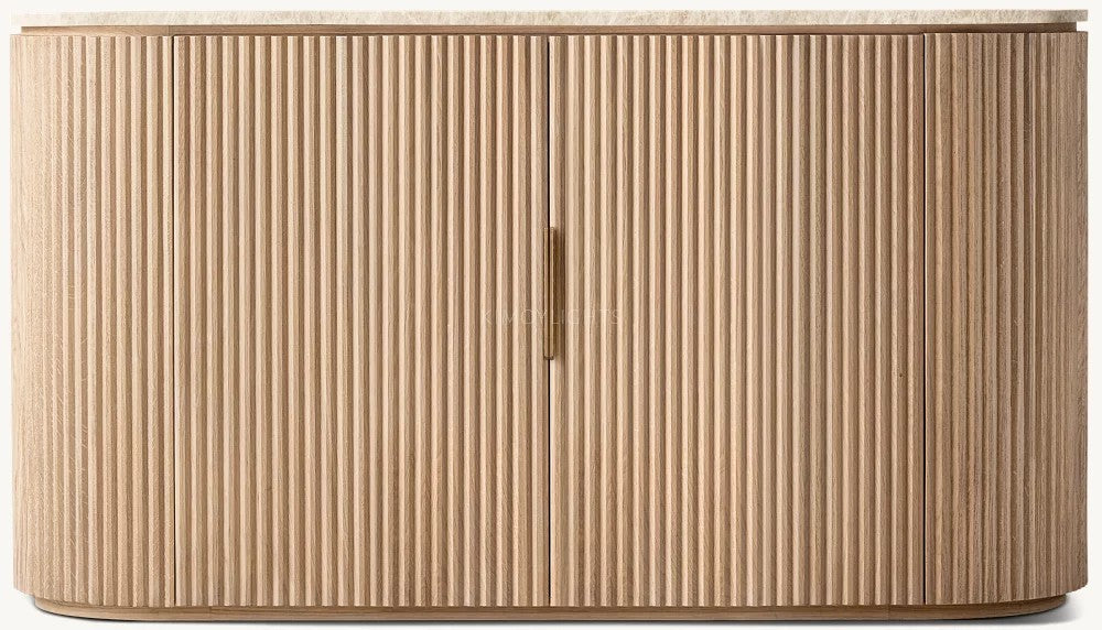 Our collection is handcrafted of reeded American white oak with a richly veined Emperador marble top. Solid vertical reeding lends juxtaposition to the contemporary, curved silhouette, appearing almost fluid in nature and seeming to float on a recessed plinth base.