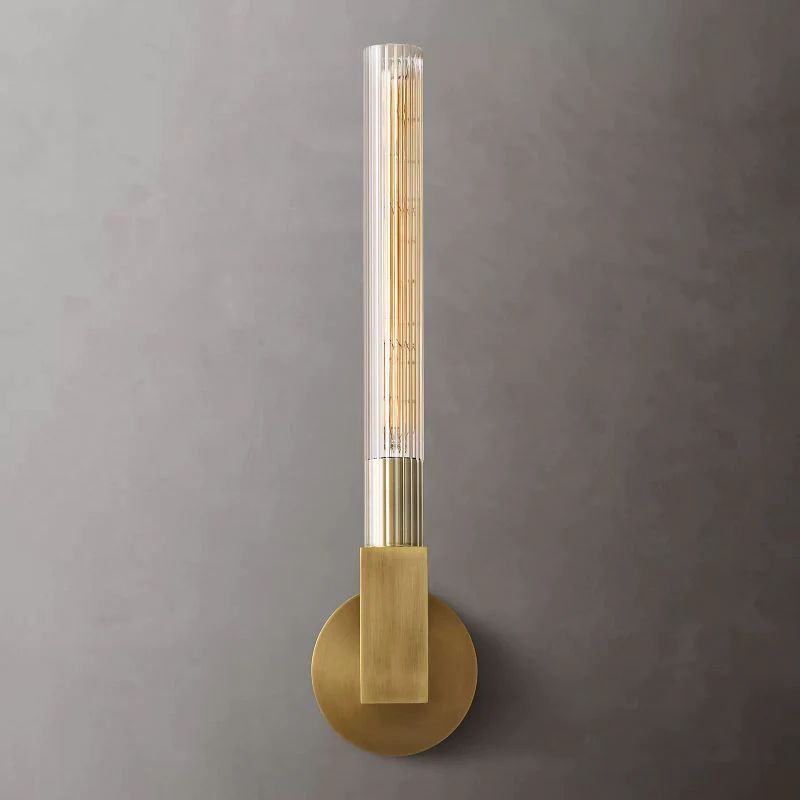 The collection chandelier is reinterpreted in brass and defined by clean lines and sharp angles, the fixture's elegant ribbed-glass hurricanes showcase Edison filament bulbs, shimmering like candles within.