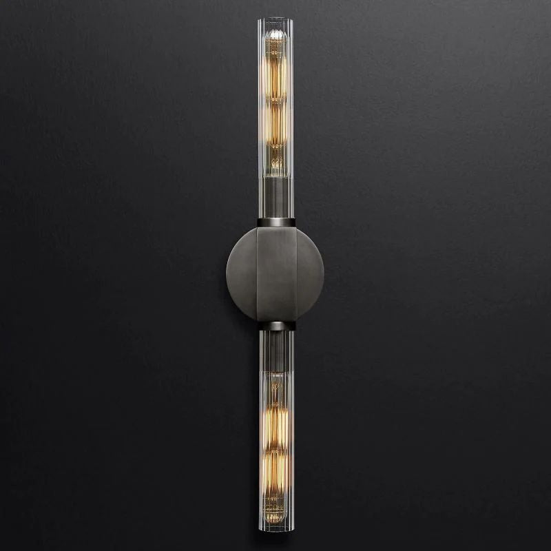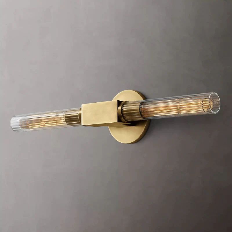 The collection chandelier is reinterpreted in brass and defined by clean lines and sharp angles, the fixture's elegant ribbed-glass hurricanes showcase Edison filament bulbs, shimmering like candles within.