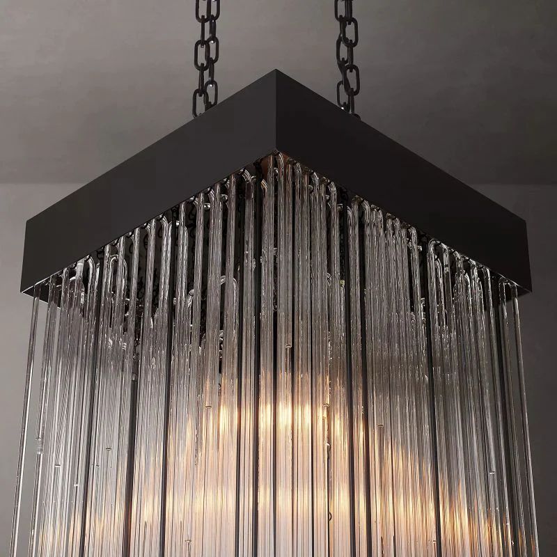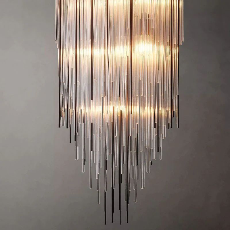 In this collection, crystal and metal rods Cascade and coexist as hundreds of slender tubes are hung asymmetrically from a smooth canopy, refracting dramatically and artfully evoking rainfall frozen in time.