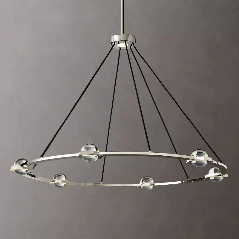 The collection features lighted crystal orbs, suspended in hexagonal fittings within a flat metal frame. The design was inspired by plans for the cenotaph of Sir Isaac Newton drawn by 18th-century architect Etienne Louis Boullée, a visionary ode to physics reinterpreted in a stunning contemporary form.