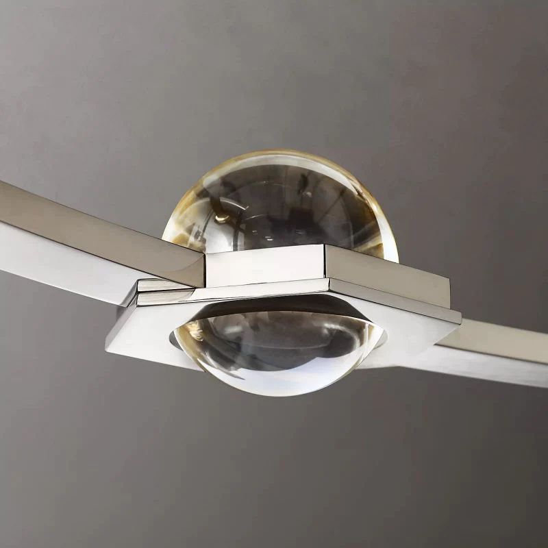 The collection features lighted crystal orbs, suspended in hexagonal fittings within a flat metal frame. The design was inspired by plans for the cenotaph of Sir Isaac Newton drawn by 18th-century architect Etienne Louis Boullée, a visionary ode to physics reinterpreted in a stunning contemporary form.
