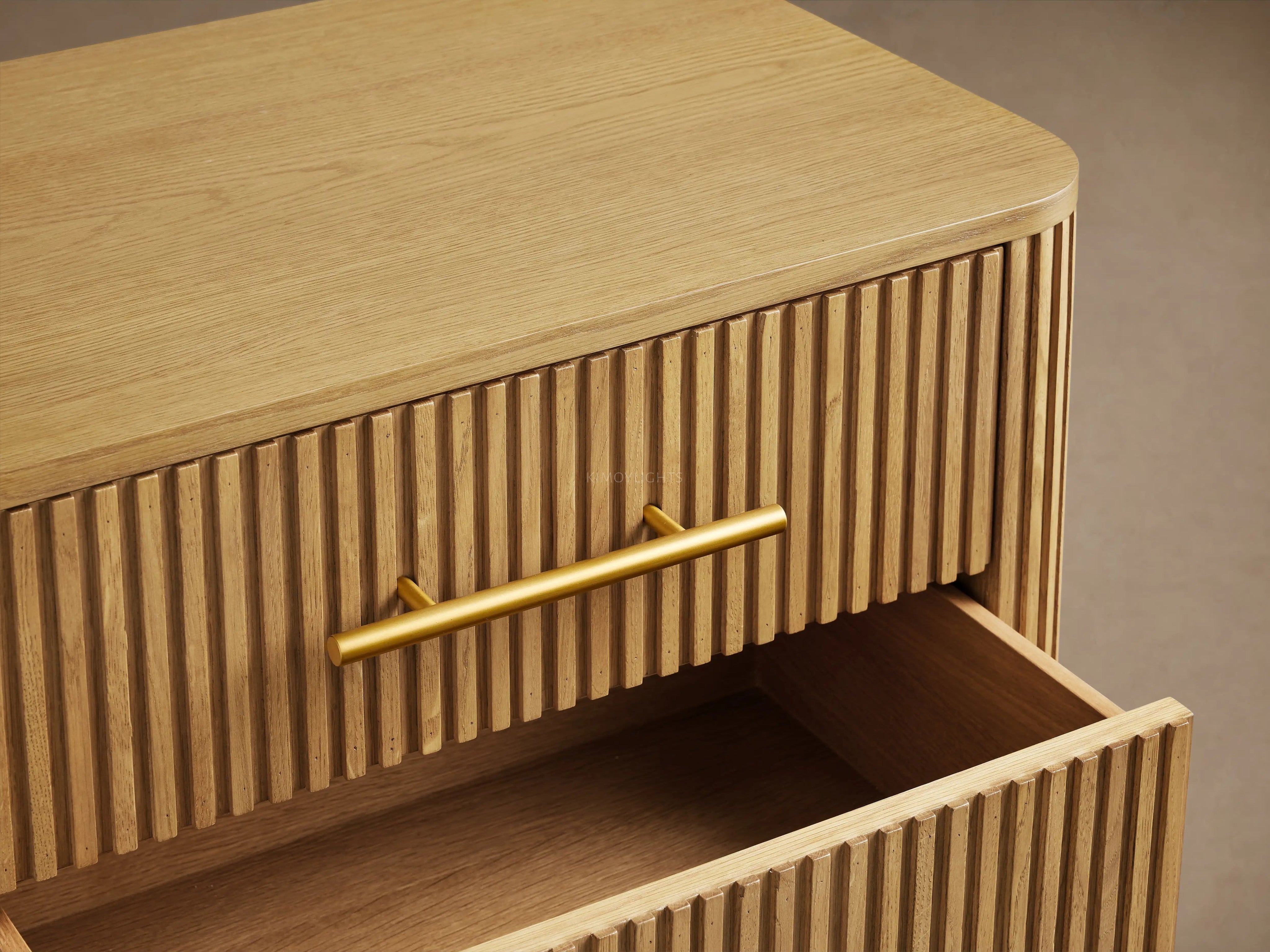 Our Finnley Bedroom Collection showcases a stunning reeded design, inviting elevated style into your bedroom oasis. Craftsman-built from hand-finished wood, each piece is luxuriously accented by brass hardware. The result is an eclectic-yet-chic bedroom suite that easily fits into the aesthetic of your home.