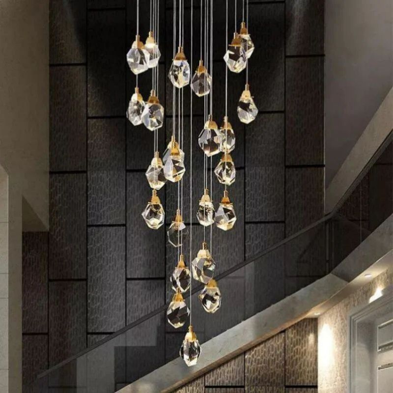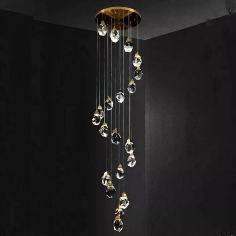Several faceted crystals suspended from ceiling in different height, Sparkles from every angle.Faceted crystal to refracted serval chinks of light,Every crystal is suspended from different height to send the sensuous plane,Make it install in your dinning room, living room or stairwell, showing elegant new decor.
