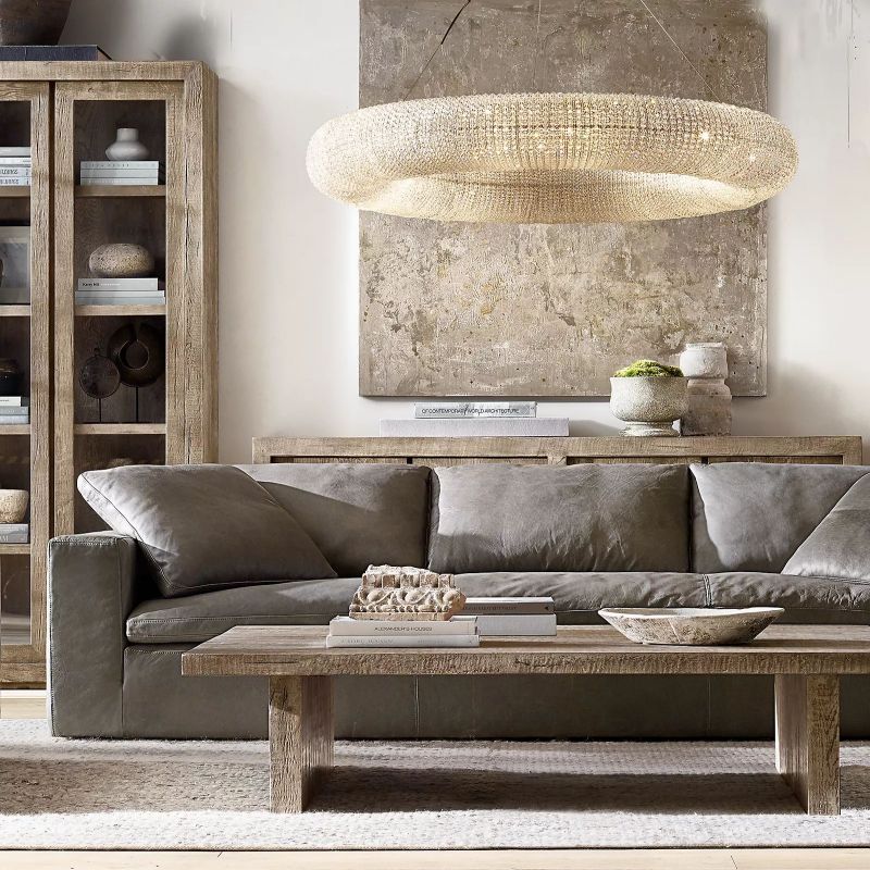 The collection of chandeliers/wall sconce, inspired by French antique designs, features thousands of faceted, hand-wrapped smoked glass beads encasing a steel frame, forming a floating sphere suspended by steel cables. The beads filter and refract light, casting a soft, inviting glow.