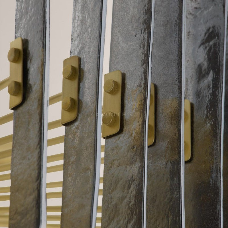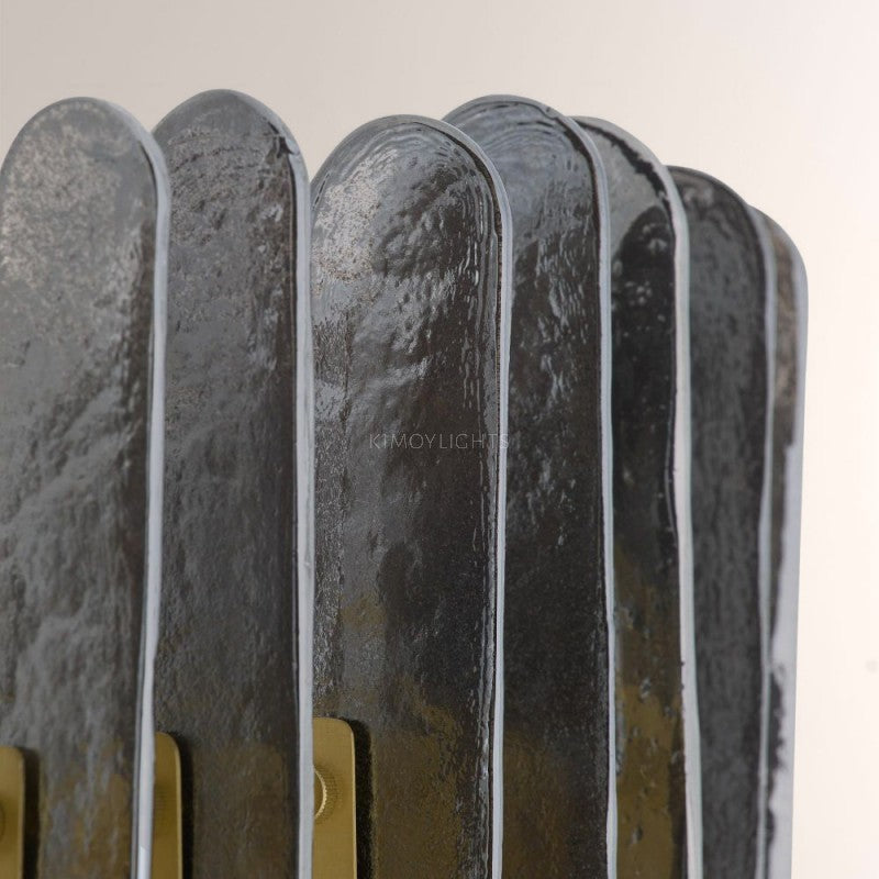 Smoky seedy slump glass panels with a lustrous finish are set into an antique brass-plated iron frame, forming a bold drum-shaped shade. Designed on a grand scale, this striking piece brings dramatic presence to larger interiors. The gentle glow enhances its atmospheric character while drawing attention to the radial design. Subtle ripples and textured details in the glass add depth and dimension. Suitable for damp-rated spaces and crafted for indoor use. Finish may vary.