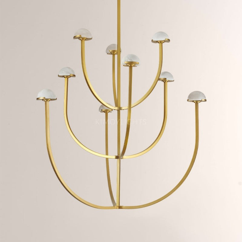 Minimalist in design yet maximalist in effect, our lighting collection was inspired by a midcentury Italian silhouette. Metal armatures reminiscent of architectural tracery support a constellation of dome-shaped, translucent alabaster shades that highlight the stone's natural veining and coloration. The sculptural form emits a warm, filtered glow.