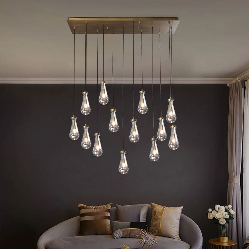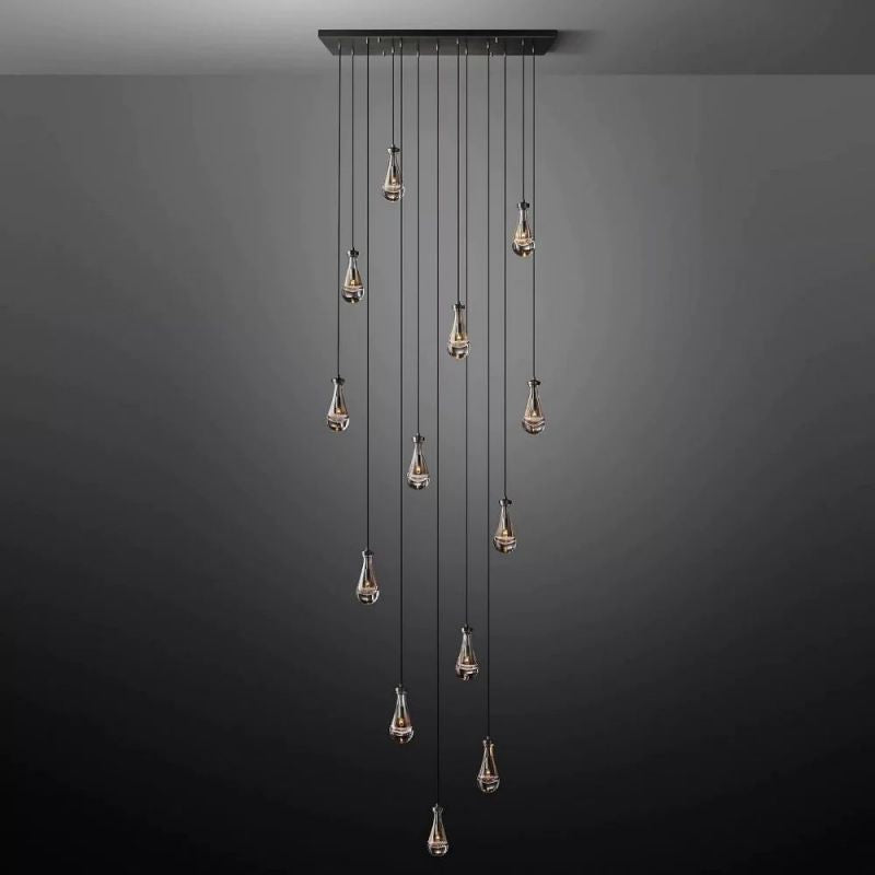 Much like the rhythm of a rainstorm itself. Suspended from slim black cords, drops of blown glass encase the bulbs – creating the illusion of underwater illumination – and cast luminous ripples that wash across ceilings and walls.