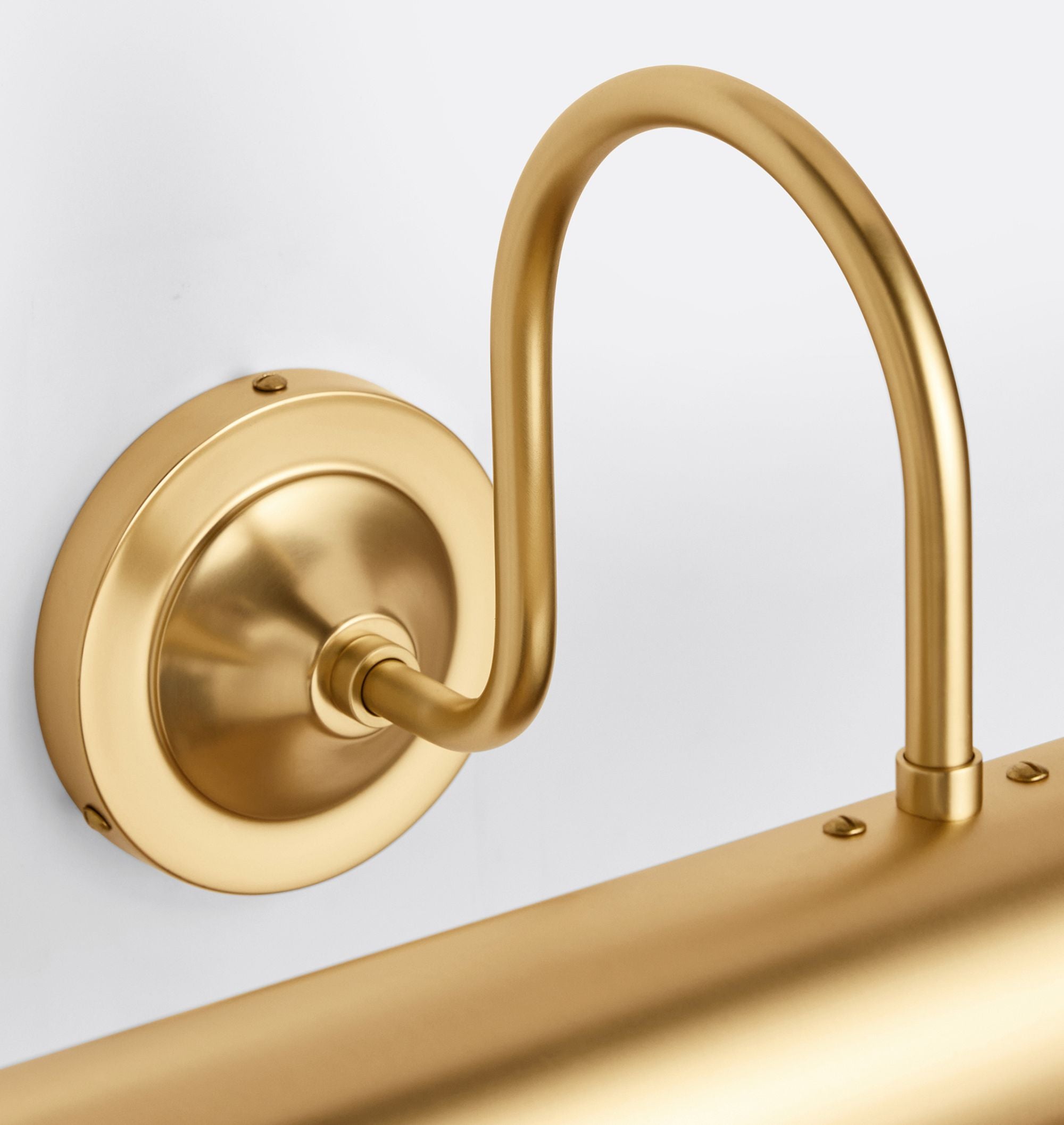 Inspired by factory-style lighting from the 1950s, Rolly brings classic character to your home. Crafted from solid brass with a curved gooseneck arm, our picture light style brings focused illumination to highlight your favourite artwork, shelving display, or gallery wall.