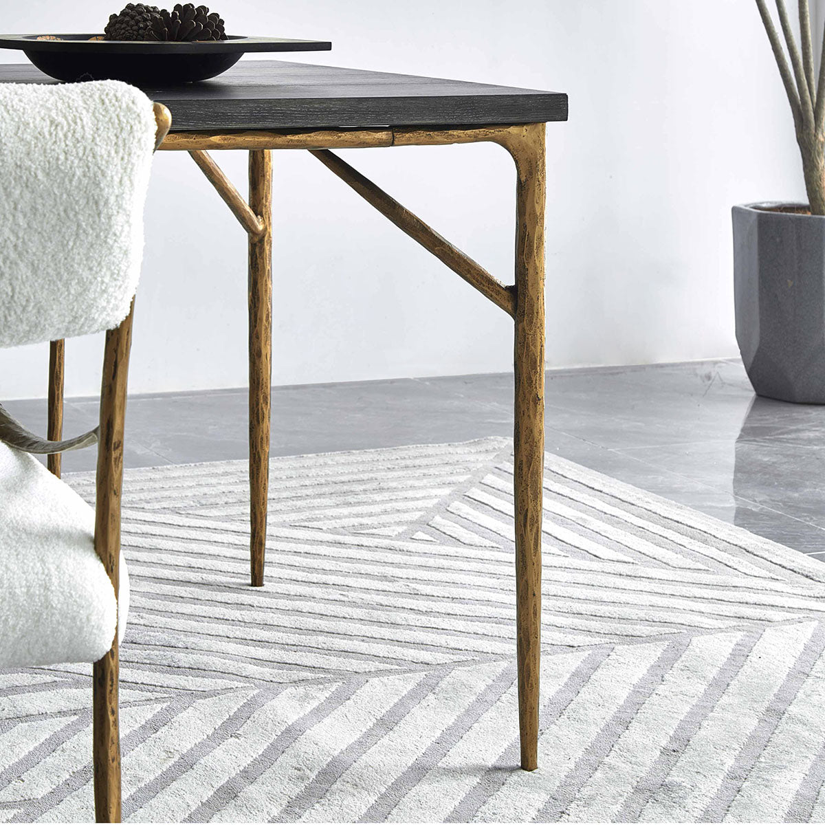 This rectangular dining table uses contrasting materials to create a unique industrial modern design. The solid wood countertop is supported by a slender vintage copper and iron frame for a transparent appearance.- The rectangular table top is made of solid wood.