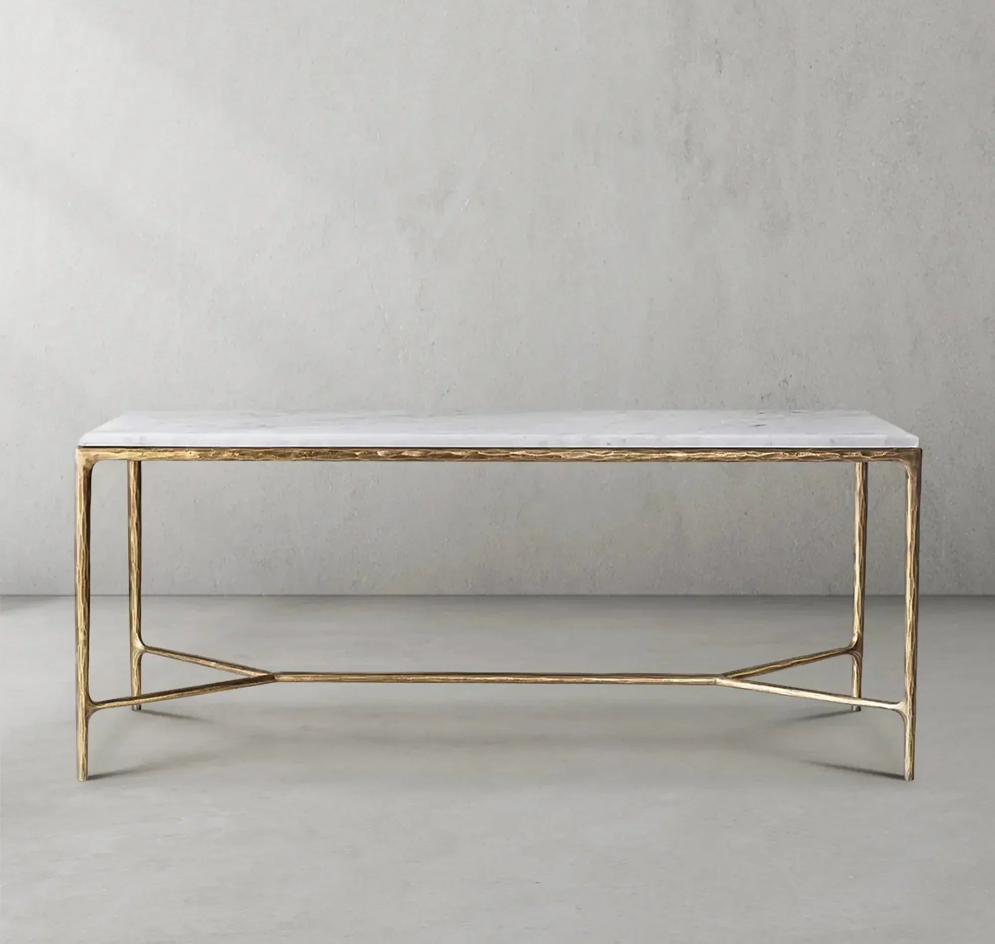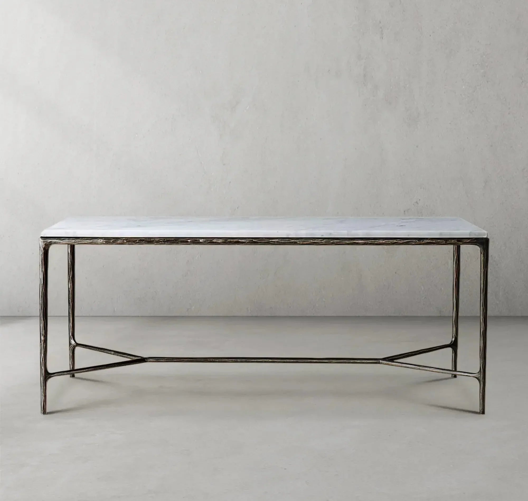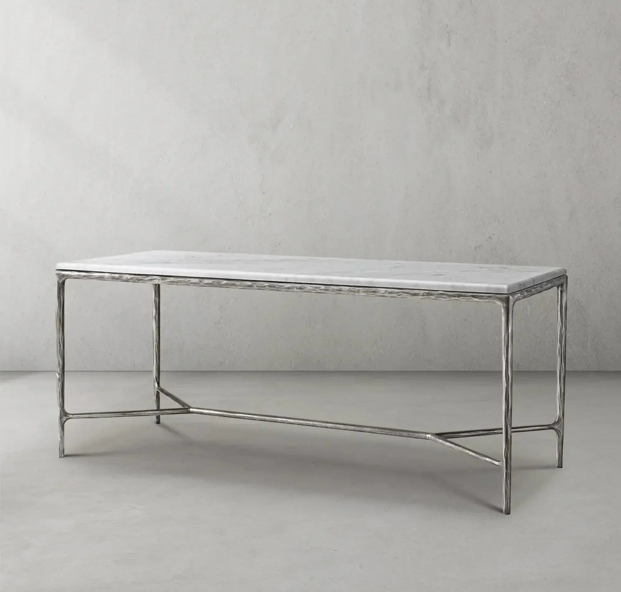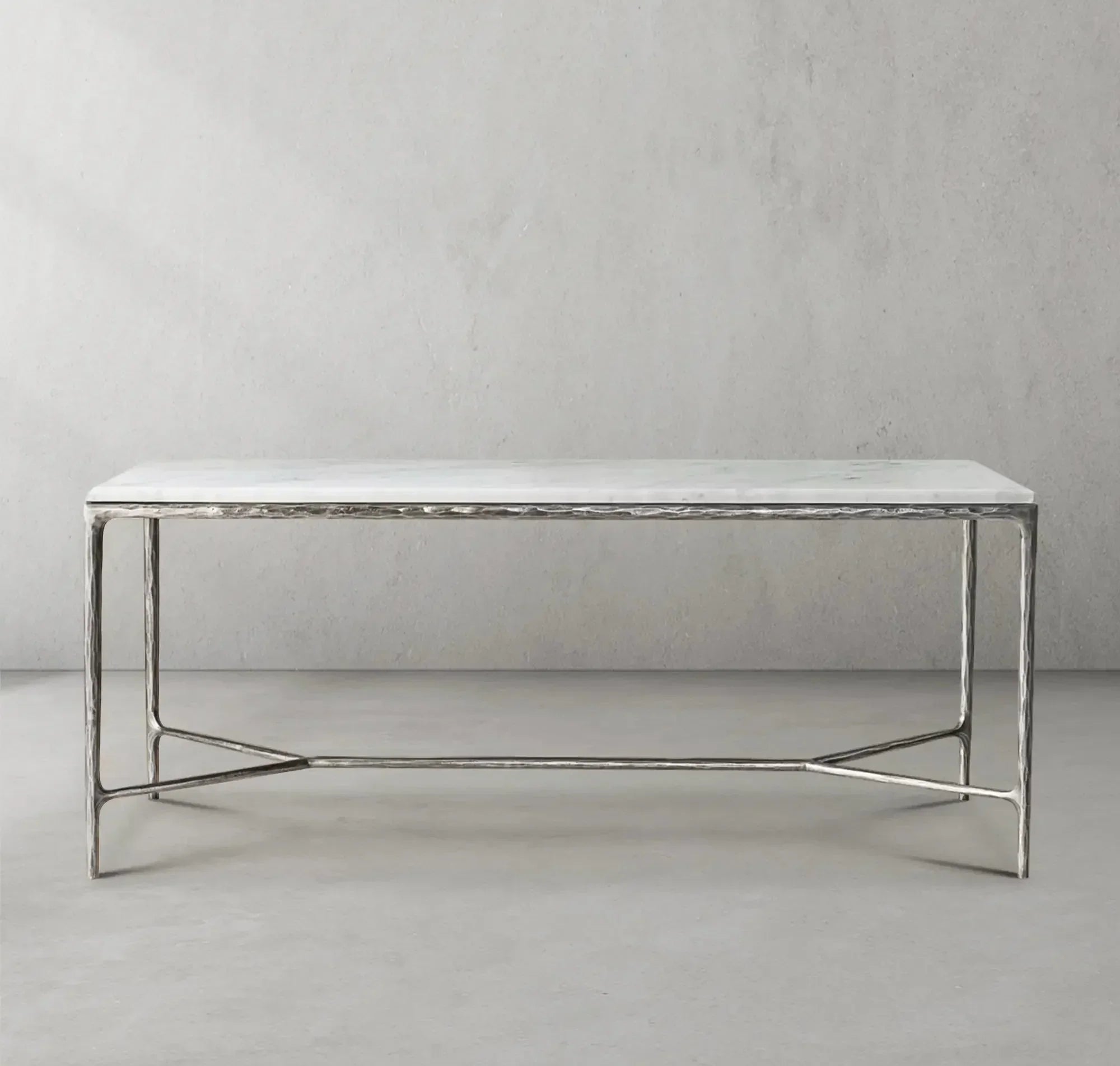 Our collection by the rustic sensibility of hand-forged metal with cool Italian marble. Employing an ancient fabrication process, artisans hand hammer the metal bars to reveal an alive, imperfect and organic texture. The pounded, tapered silhouettes are a rich counterpoint to the smooth, honed stone.