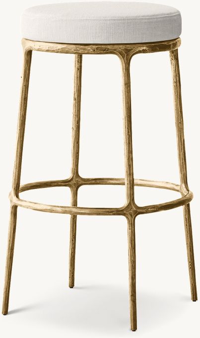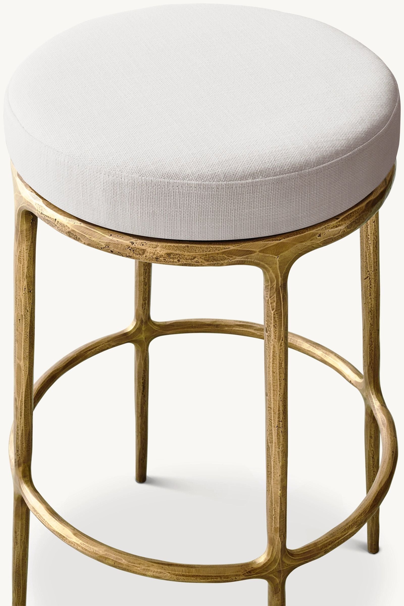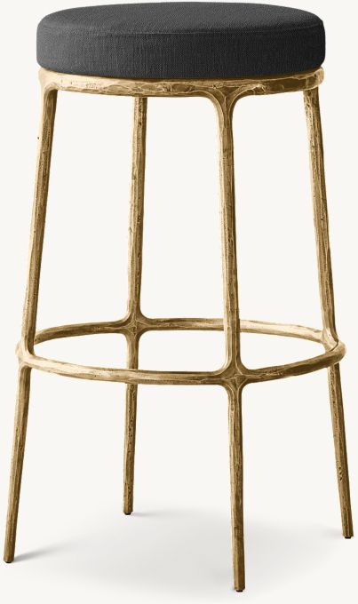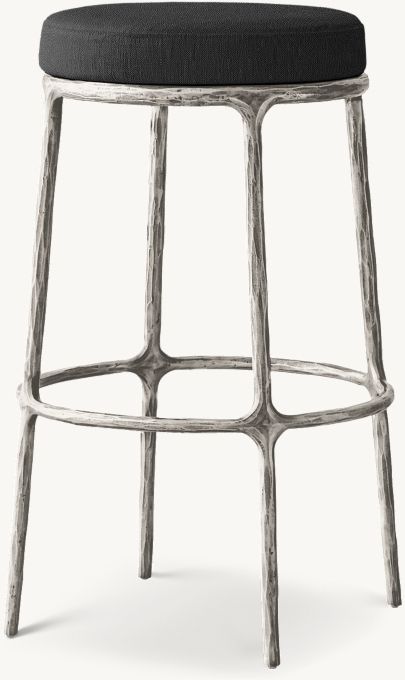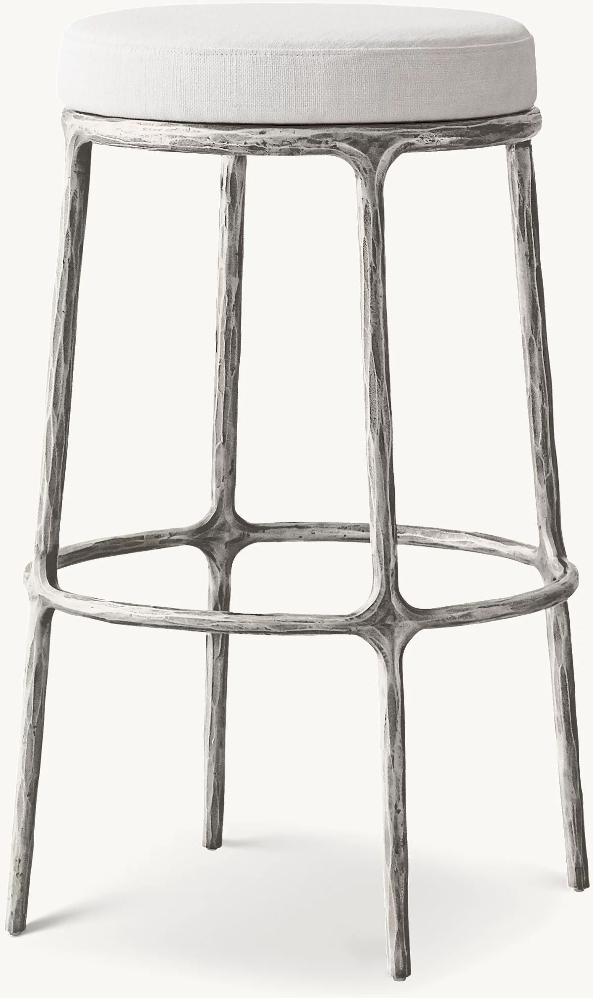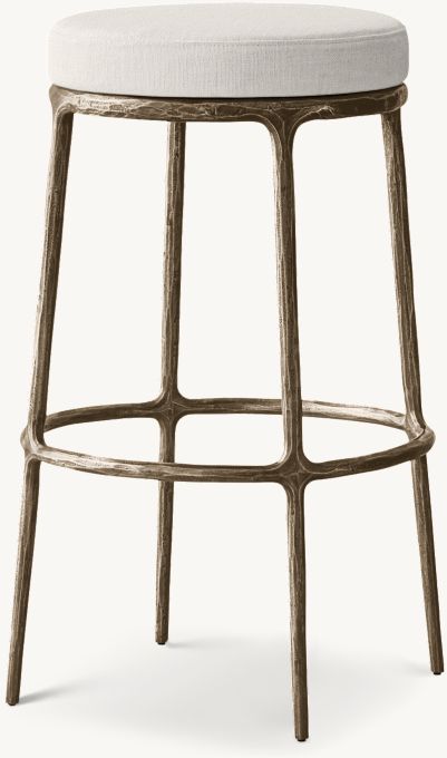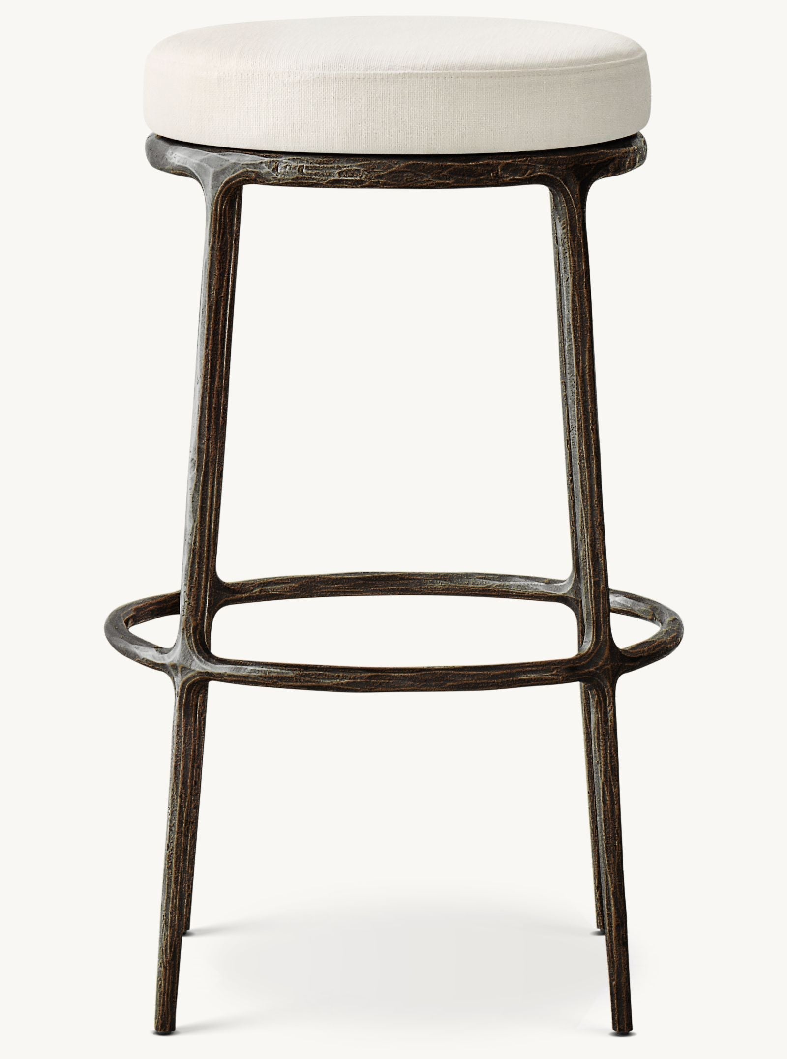 The rustic sensibility of a hand-forged metal base with tailored upholstery. Employing an ancient fabrication process, artisans hand hammer the metal bars to reveal an alive, imperfect and organic texture, a counterpoint to the frame's slender, tapered silhouette.