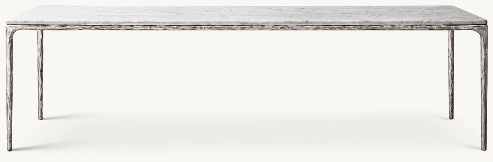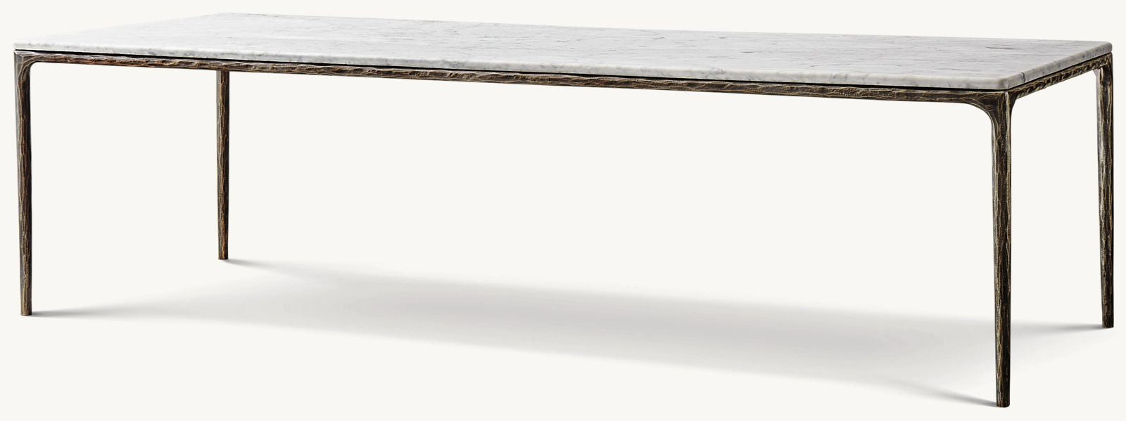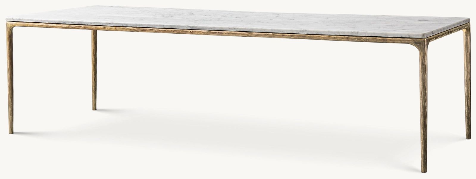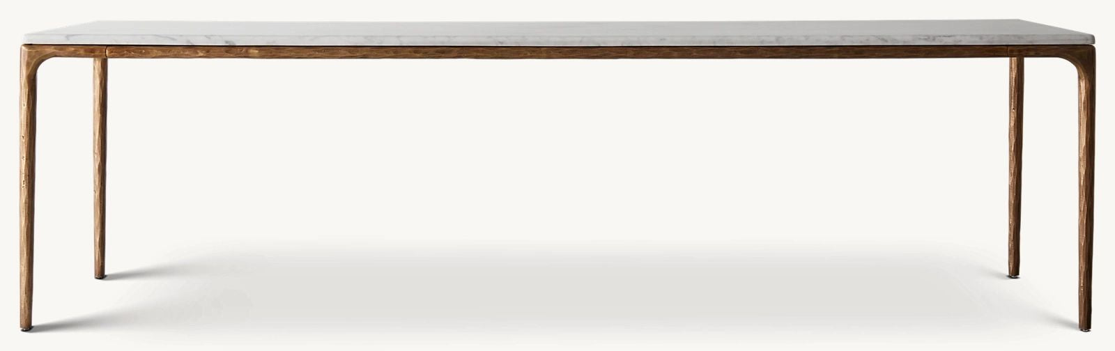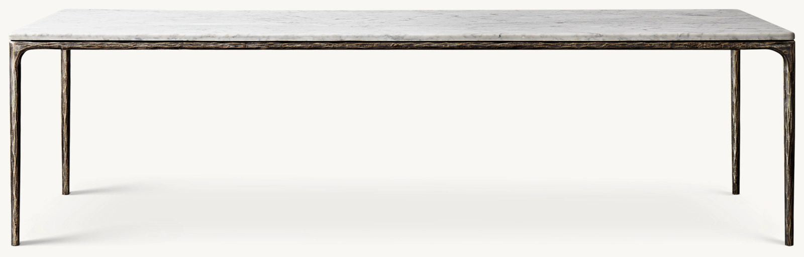 Our collection merges the rustic sensibility of hand-forged metal with cool marble. Employing an ancient fabrication process, artisans hand hammer the metal bars to reveal an alive, imperfect and organic texture. The pounded, tapered silhouettes are a rich counterpoint to the smooth, honed stone.