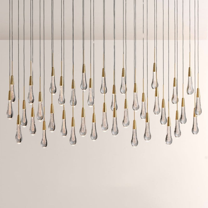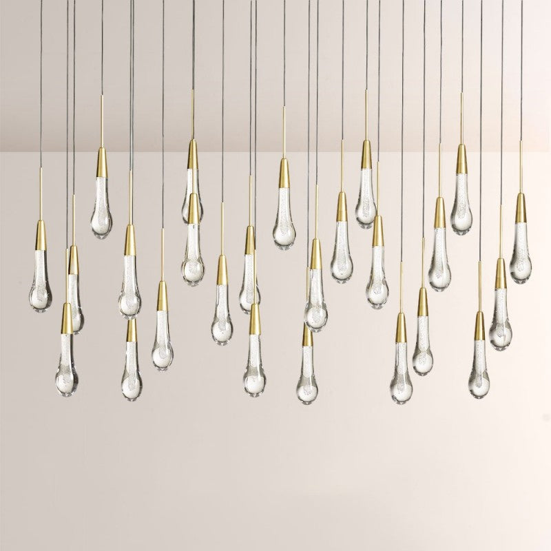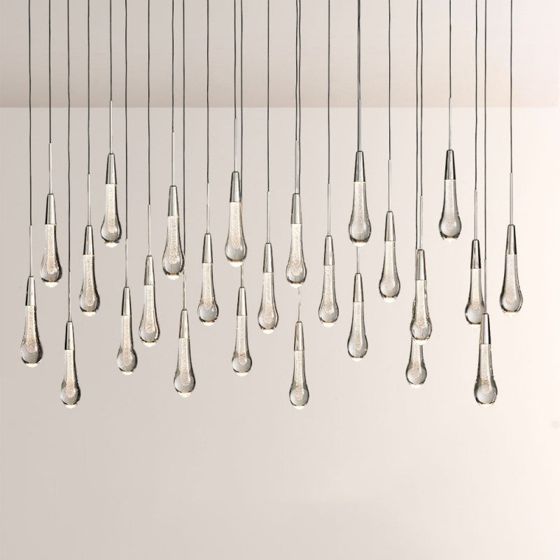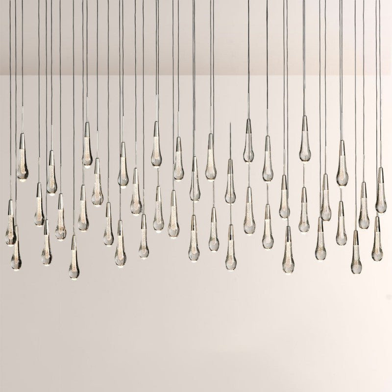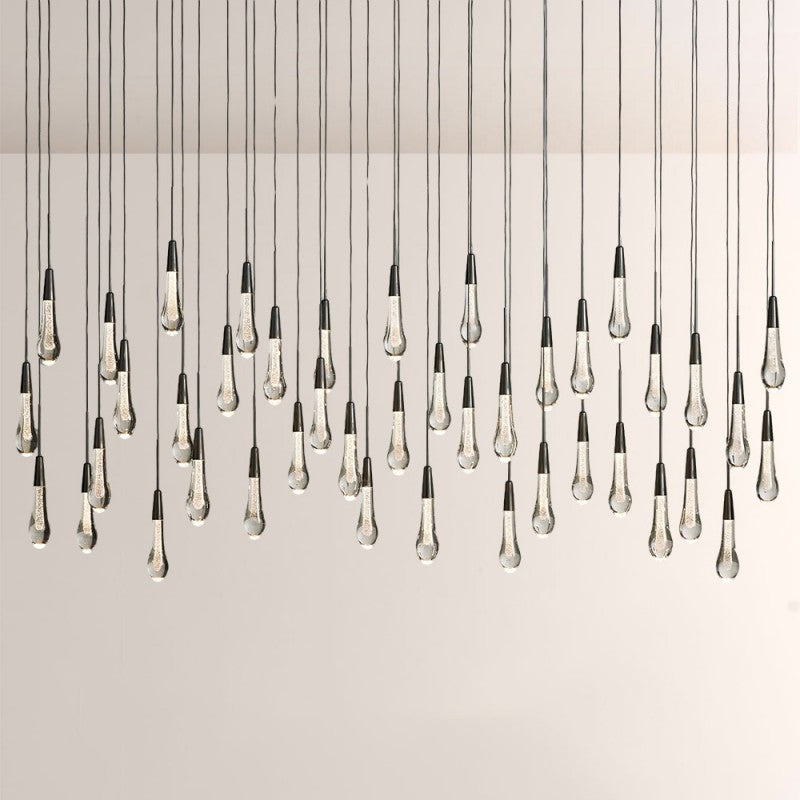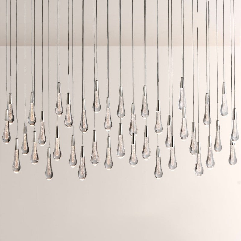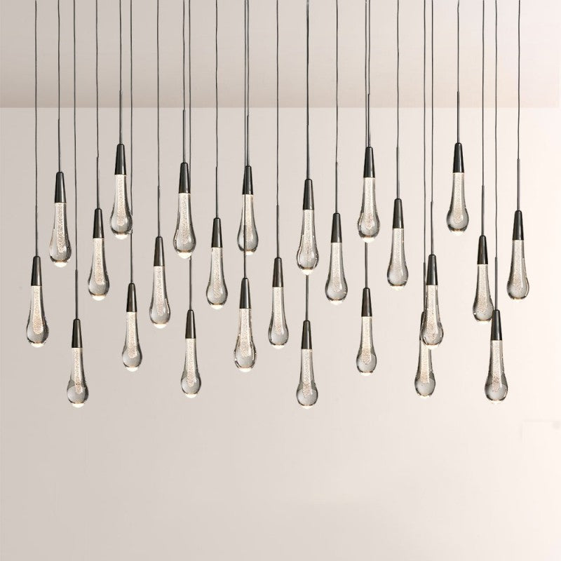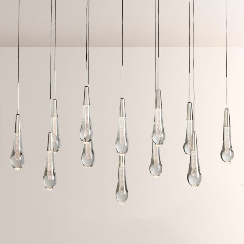 Featuring adjustable PVC cords cascading into integrated LED lights handcrafted from seeded glass, this Lighting Collection mimics the look of a fallen waterdrop.